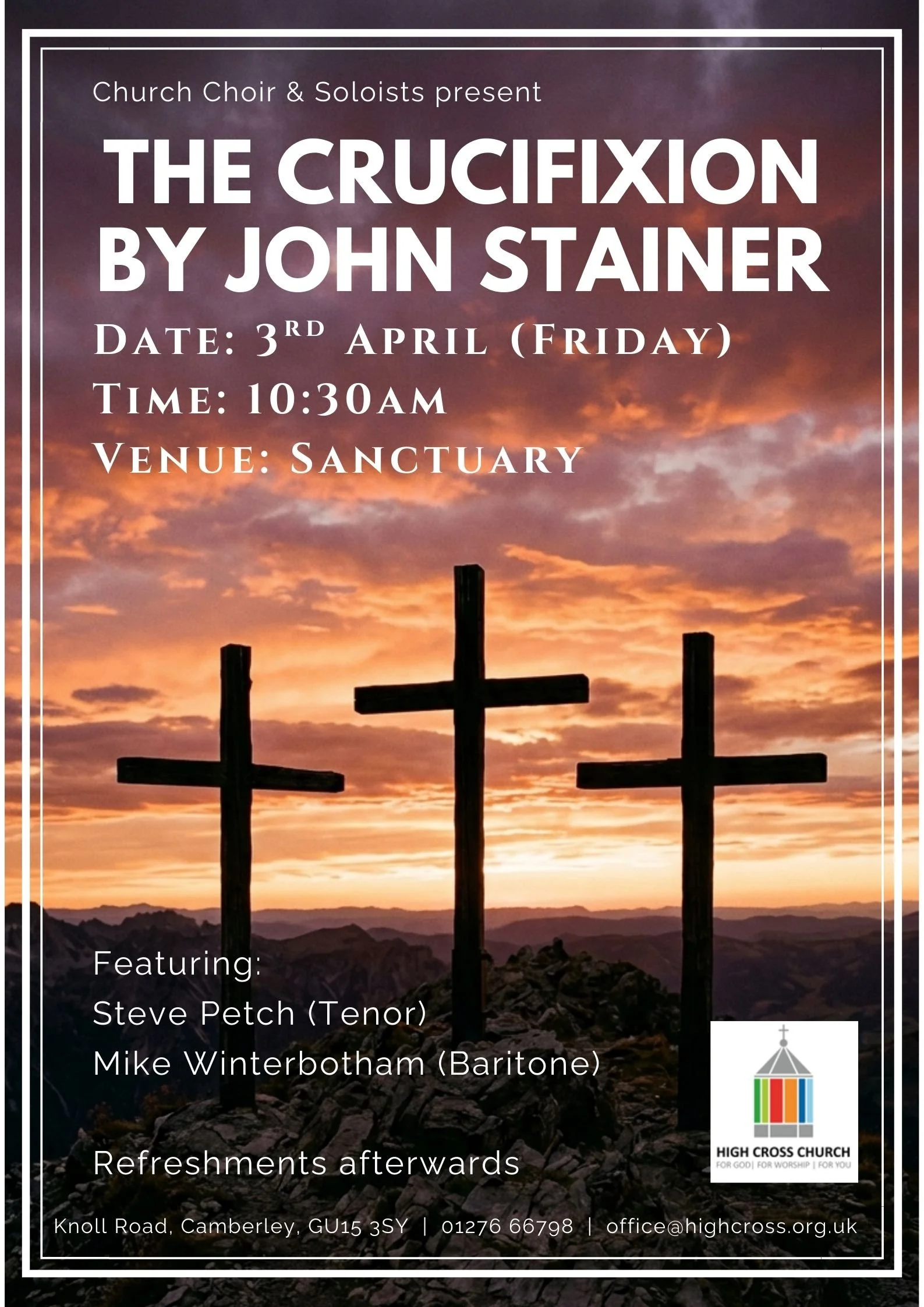 The Church Choir proudly presents The Crucifixion by John Stainer on Friday 3rd April at 10:30 am in the Sanctuary. The performance features soloists Steve Petch (tenor) and Mike Winterbotham (baritone). Refreshments will be served afterwards. Please join us for this special event!
